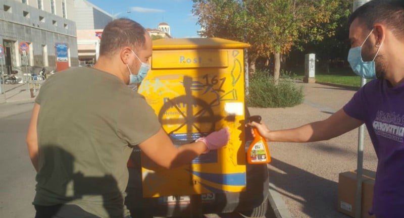 Τα ναζιστικά και φασιστικά σύμβολα που αποτύπωσαν σε δημόσιους χώρους πέριξ του Λευκού Πύργου έσβησαν σήμερα το απόγευμα, Τρίτη, μέλη της δημοτικής παράταξης “Πόλη Ανάποδα-Δύναμη Ανατροπής” στον δήμο Θεσσαλονίκης.