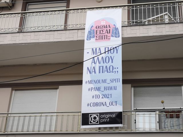 Αυτό αναγράφεται σε πανό που τοποθετήθηκε σε ένα μπαλκόνι στην πόλη της Νάουσας.