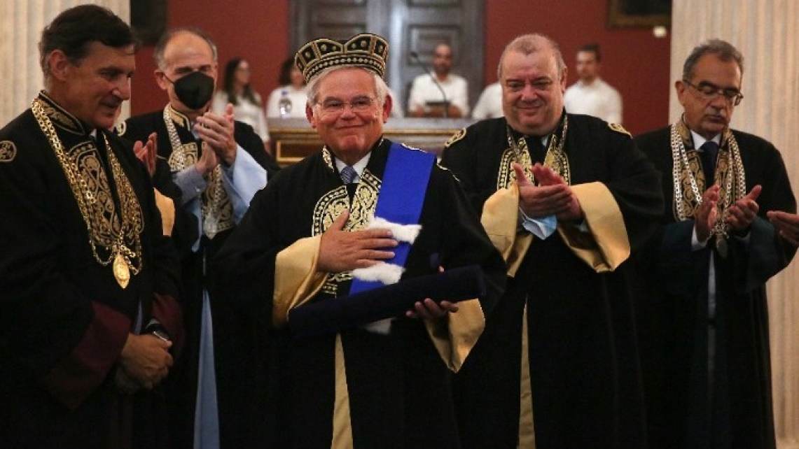 Επίτιμος διδάκτορας του Πανεπιστημίου Αθηνών αναγορεύτηκε ο αμερικανός γερουσιαστής και πρόεδρος της Επιτροπής Εξωτερικών Σχέσεων της Γερουσίας Ρόμπερτ Μενέντεζ σε τελετή που πραγματοποιήθηκε στη μεγάλη αίθουσα του Ιδρύματος.