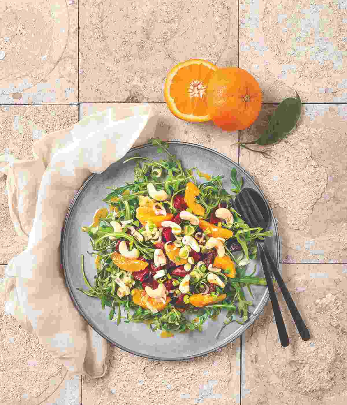 Φτιάχνουμε φρέσκια σαλάτα με ρόκα και παντζάρια. Ετοιμάζουμε και την πιο νόστιμη σάλτσα με μηλόξιδο και πορτοκάλι.