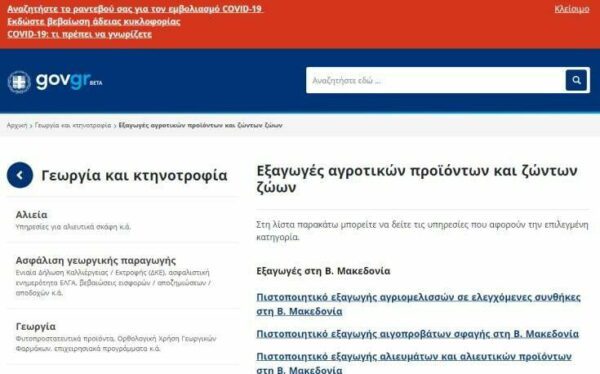 Οι ενδιαφερόμενες επιχειρήσεις μπορούν να υποβάλουν πλέον μόνο ηλεκτρονικά, μέσω του gov.gr, τις σχετικές αιτήσεις, συμπληρώνοντας όλα τα απαραίτητα στοιχεία για την εξαγωγή προϊόντων όπως τα γαλακτοκομικά, τα αλιεύματα, το μέλι, το κρέας, τα αυγά κα.