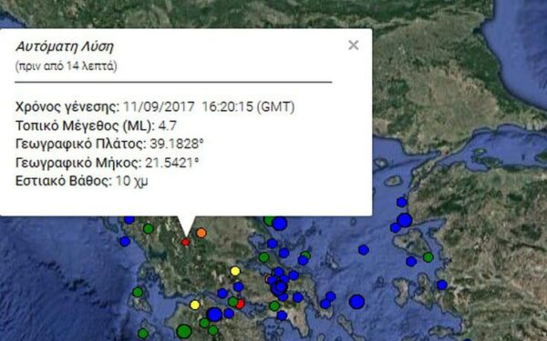 Ισχυρή σεισμική δόνηση μεγέθους 4,7 βαθμών της κλίμακας Ρίχτερ σημειώθηκε στις 19:20 16 χιλιόμετρα δυτικά της Καρδίτσας και 41 χιλιόμετρα βορείως του Καρπενησίου. Το εστιακό βάθος του σεισμού υπολογίζεται στα 10 χιλιόμετρα, σύμφωνα με το Γεωδυναμικό