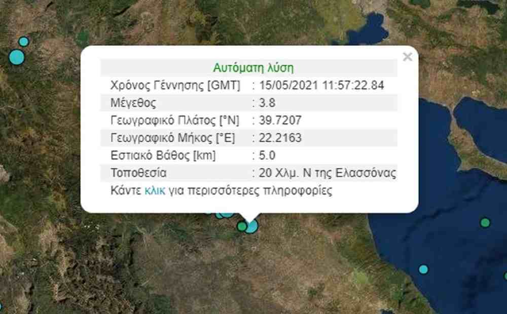 Σύμφωνα με το Γεωδυναμικό Ινστιτούτο ο σεισμός έγινε 20 χλμ. νότια της Ελασσόνας και είχε εστιακό βάθος στα 5 χλμ.