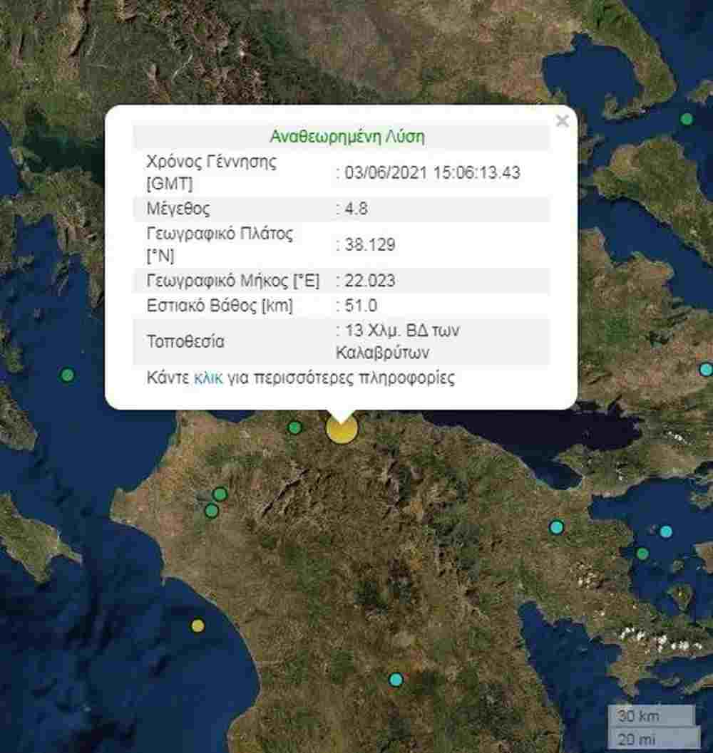 Σεισμός 4,8 βαθμών της κλίμακας Ρίχτερ σημειώθηκε στις 18:06 στην Αχαΐα και συγκεκριμένα κοντά στο Αίγιο και στα Καλάβρυτα.