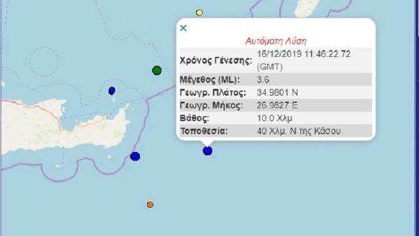 Σεισμός μεγέθους 3,6 βαθμών της κλίμακας Ρίχτερ σημειώθηκε ανοιχτά της Κάσου. Σύμφωνα με το Γεωδυναμικό, ο σεισμός είχε επίκεντρο 40 χλμ νότια της Κάσου, ενώ το εστιακό βάθος ήταν 10 χλμ.