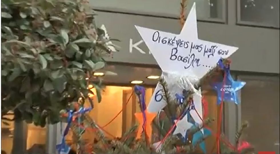 “Οι σκέψεις μας μαζί σου Βασίλη”, γράφει το αστέρι στην κορυφή του δέντρου, ενώ σε άλλο αστέρι στα κλαδιά διαβάζουμε “Καλό παράδεισο μικρούλη, να προσέχεις εκεί ψηλά”