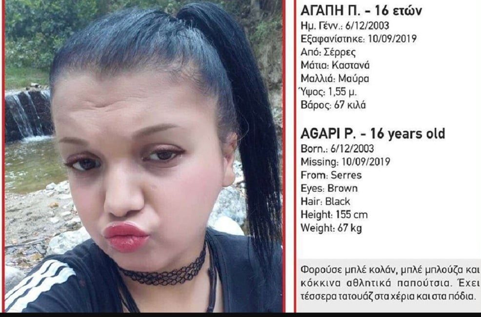 Στις 10/09/2019 και ώρα 21:30, εξαφανίστηκε από την περιοχή των Σερρών, η Αγάπη Π., 16 ετών. Η Αγάπη Π. έχει ύψος 1.55 μ., ζυγίζει 67 κιλά, έχει μαύρα μαλλιά και καστανά μάτια.