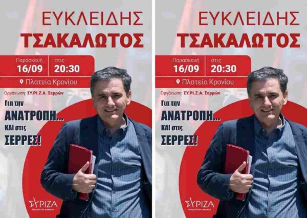Ο πρώην υπουργός Οικονομικών Ευκλείδης Τσακαλώτος θα είναι ο κεντρικός ομιλητής σε ανοιχτή εκδήλωση που διοργανώνει η Νομαρχιακή Επιτροπή του ΣΥΡΙΖΑ Σερρών την Παρασκευή 16 Σεπτεμβρίου, στην πλατεία Κρονίου στις 8 το βράδυ.