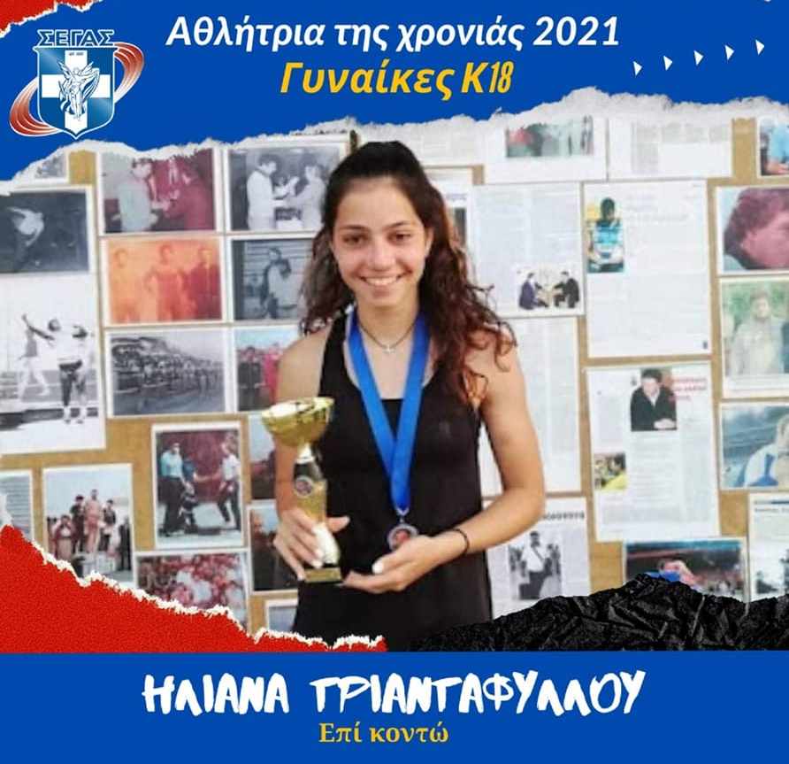 Η 16χρονη αθλήτρια του επί κοντώ, με καταγωγή από την Κερκίνη Σερρών, συγκέντρωσε 1.334 ψήφους στην ψηφοφορία κοινού του ΣΕΓΑΣ για το 2021. Η Ηλιάνα Τριανταφύλλου κατάκτησε την περασμένη χρονιά την 1η θέση στο Πανελλήνιο Πρωτάθλημα Κ20 στη Θεσσαλονίκη με 4,12 μ., φετινό και ατομικό ρεκόρ, και ήταν 14η με 3,90 μ. στο Ευρωπαϊκό Πρωτάθλημα Κ20 στο Ταλίν, ενώ ήταν και η μικρότερη σε ηλικία αθλήτρια που συμμετείχε στο παγκόσμιο Πρωτάθλημα που πραγματοποιήθηκε στην Κένυα.