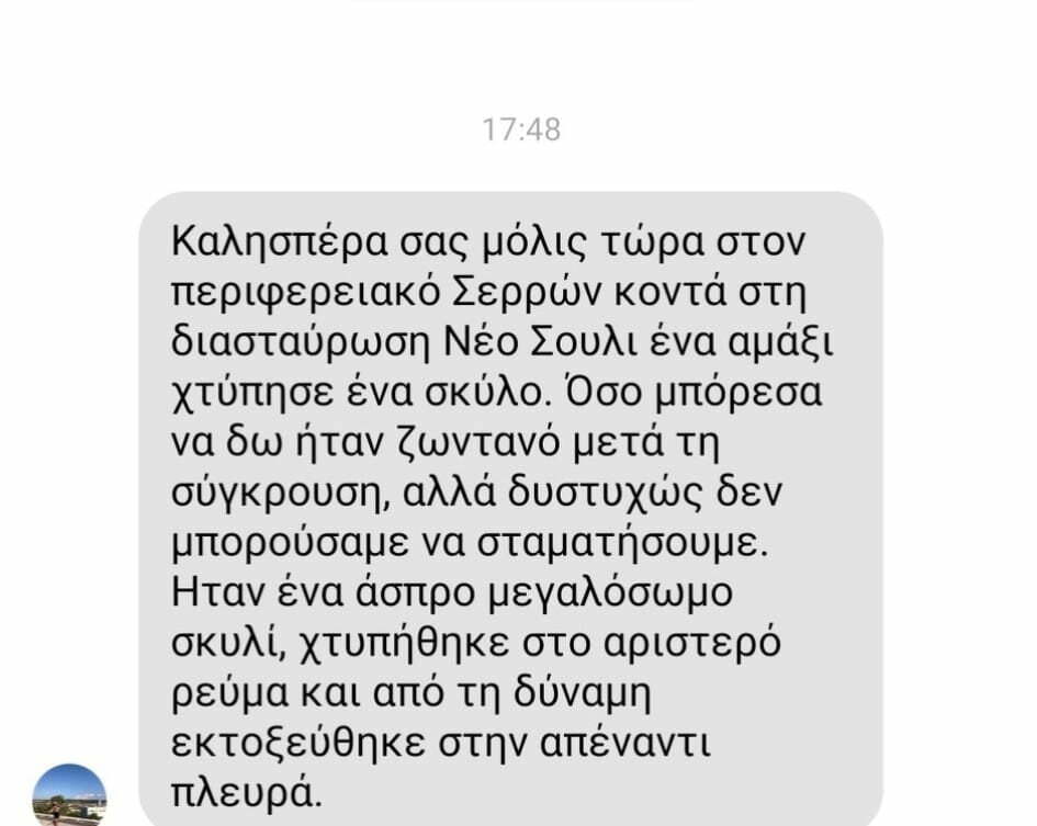 Ατύχημα και εγκατάλειψη ζώου συνέβη σήμερα το βράδυ, Παρασκευή 28 Ιανουαρίου στην διασταύρωση του Νέου Σουλίου, όπως μας ενημερώνει με ανάρτησή του ο Φιλοζωικός Σύλλογος Σερρών
