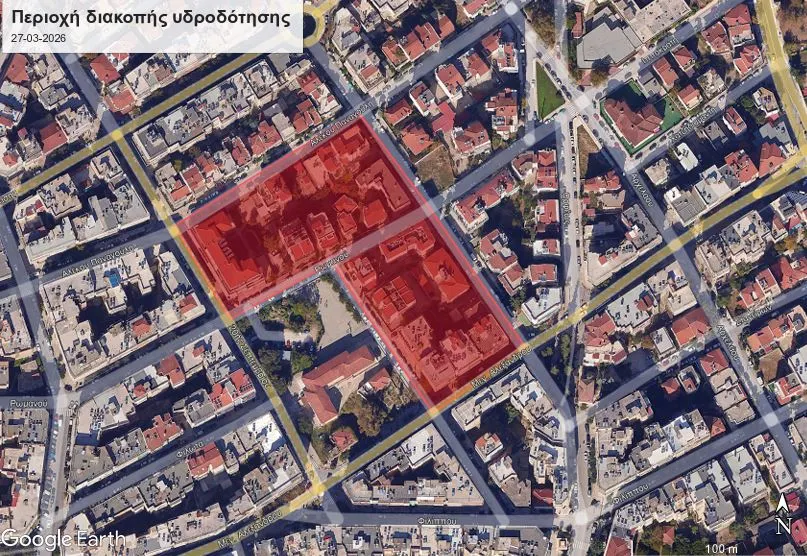 Λόγω αναγκαίας επισκευής βλάβης δευτερεύοντος δικτύου ύδρευσης επί της οδού Χατζηπανταζή, αύριο Παρασκευή 27-03-2026 και στις ώρες 09:00’ έως 13:00’, θα σημειωθεί διακοπή υδροδότησης στην περιοχή που περικλείεται από τις οδούς Μ. Αλεξάνδρου, Παπασυνοδινού, Ρωμανού, 20ης Σεπτεμβρίου, Αλέκου Παναγούλη και Χατζηπανταζή.