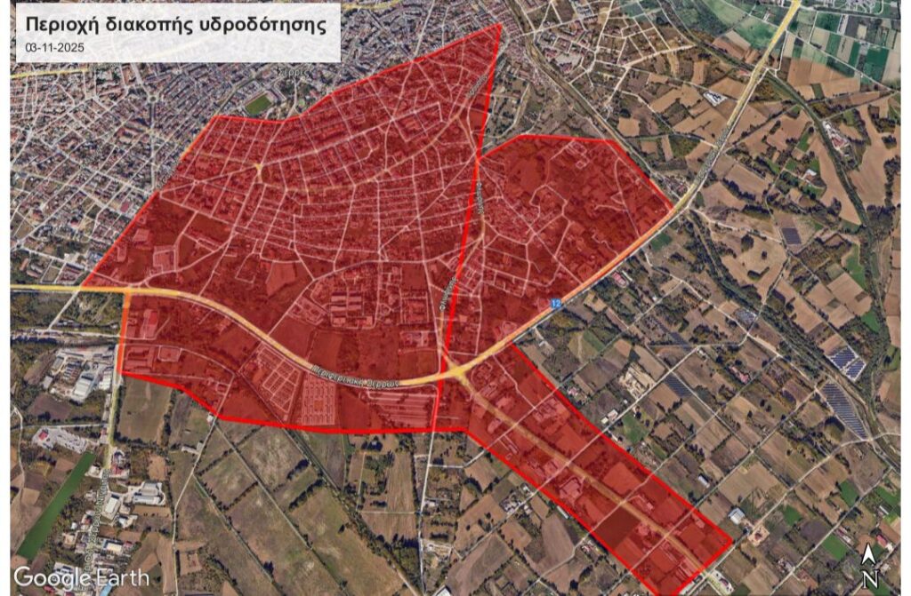 “Λόγω θραύσης αγωγού πρωτεύοντος δικτύου ύδρευσης από υπαιτιότητα τρίτων, επί της οδού Νικομηδείας στις Σέρρες, σήμερα 03-11-2025 από τώρα έως 20:00 μμ, θα σημειωθεί διακοπή υδροδότησης στις περιοχές Προφ. Ηλία, Νέου Κόσμου, Κιουπλιών, Σφαγείων, Σαράντα Μαρτύρων, Αγ. Αθανασίου, Νεόκτιστων Αεροδρομίου, επαρχ. οδού Σερρών – Νεοχωρίου καθώς και περιοχής Κρίνου.
