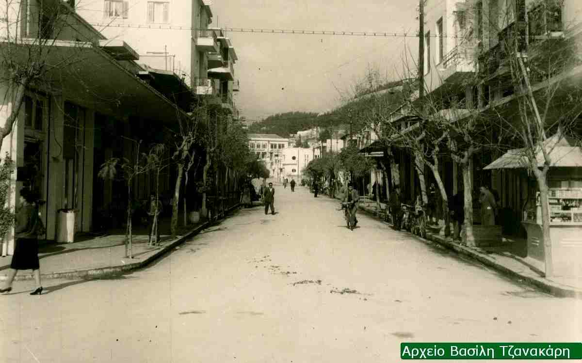 “Η οδός Λεωνίδα Παπαπαύλου (παραπλεύρως ξενοδοχείου “Μητρόπολις”), φωτογραφημένη από την πλατεία 25ης Μαρτίου (Εμπορίου) στις αρχές της δεκαετίας του ΄50. Αριστερά το τρίτο κατάστημα ήταν το… θρυλικό ζυθεστιατόριο “Παπαγάλος” του Κων. και αργότερα του Αθ. Δραστόπουλου. Στο βάθος το λευκό κτίριο είναι το για χρόνια ιατρείο του γιατρού Τσάμη και αργότερα αστυνομικό τμήμα, και πίσω από αυτό το Α΄Γυμνασιο και Λύκειο.”