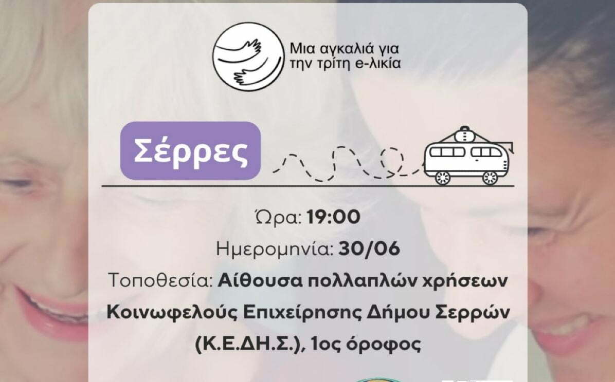 Ανοιχτή εκδήλωση για το κοινό των Σερρών με θέμα το δικαίωμα στην ισότιμη πρόσβαση στον ψηφιακό κόσμο για τα άτομα μεγαλύτερης ηλικίας θα πραγματοποιηθεί στην Αίθουσα πολλαπλών χρήσεων Κοινωφελούς Επιχείρησης Δήμου Σερρών την Πέμπτη 30 Ιουνίου στις 19:00 από την μη κερδοσκοπική οργάνωση People Behind σε συνεργασία με την Κοινωφελή Επιχείρηση Δήμου Σερρών (Κ.Ε.ΔΗ.Σ) και τον Σύλλογο Οικογενειών και Φίλων για την Ψυχική Υγεία (ΣΟΦΨΥ) Ν. Σερρών.