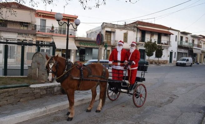 Και δεν θα είχε την γιορτινή, ξεχωριστή “πινελιά” των ημερών, αν δεν ανταποκρίνονταν στο κάλεσμα ο κ. Παναγιώτης Φτιάκας και ο κ. Μανόλης Αδάμος από τον Ιππικό Όμιλο Νιγρίτας, οι οποίοι ήρθαν ως Αγιο-Βασίληδες στο χωριό, πάνω στην άμαξα, φέρνοντας τα δώρα!