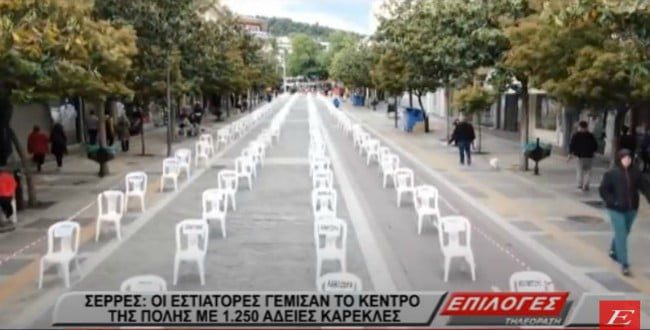 Ηχηρό μήνυμα έστειλαν οι Σέρρες για τα νέα μέτρα λειτουργίας των καταστημάτων εστίασης από τον κορωνοϊό. Πάνω από 1.250 άδειες καρέκλες τοποθετήθηκαν στο κέντρο των Σερρών.