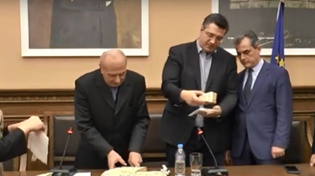 Τη καθιερωμένη βασιλόπιτα έκοψαν ο Περιφερειάρχης Κεντρικής Μακεδονίας Απόστολος Τζιτζικώστας και ο Αντιπεριφερειάρχης Σερρών Γιάννης Μωυσιάδης στην Π.Ε. Σερρών, το μεσημέρι της Παρασκευής.