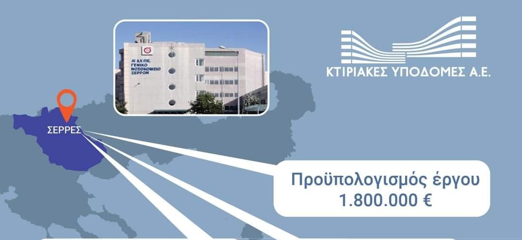 Η Κτιριακές Υποδομές Α.Ε προκηρύσσει ανοιχτό διαγωνισμό για την ανάθεση του έργου: «ΠΡΟΣΘΗΚΗ KAT’ΕΠΕΚΤΑΣΗ ΨΥΧΙΑΤΡΙΚΟΥ ΤΜΗΜΑΤΟΣ ΣΤΟ ΓΕΝΙΚΟ ΝΟΣΟΚΟΜΕΙΟ ΣΕΡΡΩΝ», με συνολική δαπάνη προϋπολογισμού μελέτης 1.800.000,00 Ευρώ.