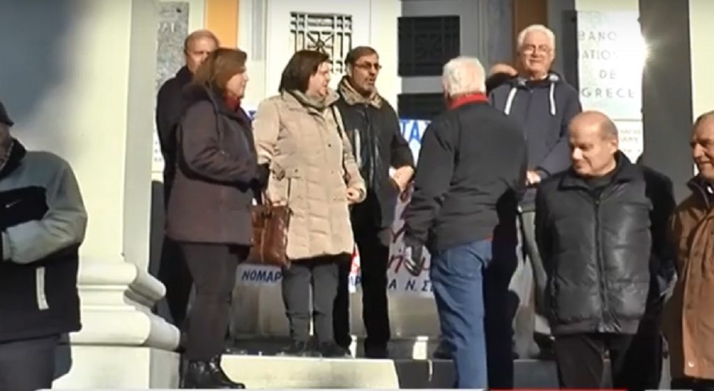 Συμβολική κατάληψη στο κεντρικό της Εθνικής Τράπεζας στις Σέρρες πραγματοποίησαν οι συνταξιούχοι της ΕΤΕ, διαμαρτυρόμενοι για τη μη καταβολή των επικουρικών συντάξεων για περισσότερους από 12 μήνες.