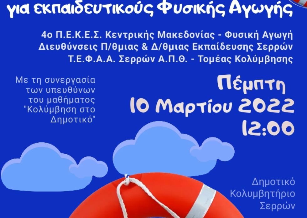 Την Πέμπτη 10-3-2022 ώρα: 12:00 στο Δημοτικό Κολυμβητήριο Σερρών, θα πραγματοποιηθεί Επιμορφωτικό σεμινάριο «Ναυαγοσωστικής» για εκπαιδευτικούς Φυσικής Αγωγής. Το σεμινάριο διοργανώνεται από το 4ο Περιφερειακό Κέντρο Εκπαιδευτικού Σχεδιασμού (ΠΕ.Κ.Ε.Σ.) Κεντρικής Μακεδονίας και τον Συντονιστή Εκπαιδευτικού Έργου Φυσικής Αγωγής, με την σύμπραξη του Τομέα Κολύμβησης του ΤΕΦΑΑ Σερρών, των Δ/σεων Π/θμιας και Δ/θμιας Εκπαίδευσης Σερρών και των Υπευθύνων του μαθήματος Κολύμβησης στα Δημοτικά Σχολεία.