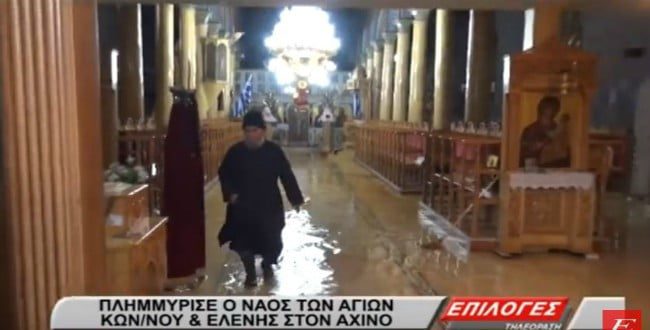 Από τις έντονες βροχοπτώσεις που έπεσαν το τελευταίο 24ωρο στην Τοπική Κοινότητα Αχινού, στον Δήμο Βισαλτίας πλημμύρισε ο Ιερός Ναός των Αγίων Κωνσταντίνου και Ελένης.