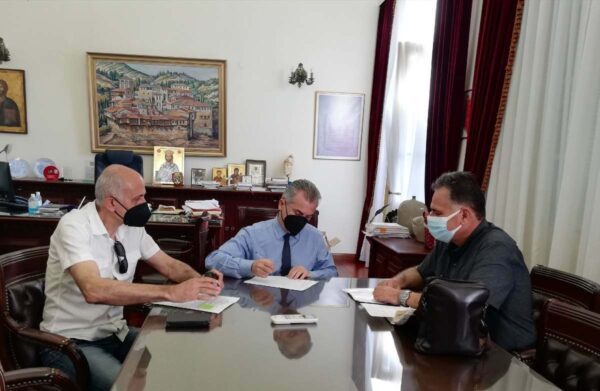 Σύμβαση με θέμα «Καθαρισμός ρέματος Ν. Σκοπού και κατασκευή κιβωτοειδούς τεχνικού απορροής στην θέση γέφυρας Ν. Σκοπού- Βαλτοτοπίου», υπεγράφη σήμερα, Τετάρτη 18 Μαΐου 2022, μεταξύ του Αντιπεριφερειάρχη Σερρών Παναγιώτη Σπυρόπουλου και του εκπροσώπου της αναδόχου εργολαβικής εταιρείας, στο γραφείο του Αντιπεριφερειάρχη Σερρών, στο Διοικητήριο.