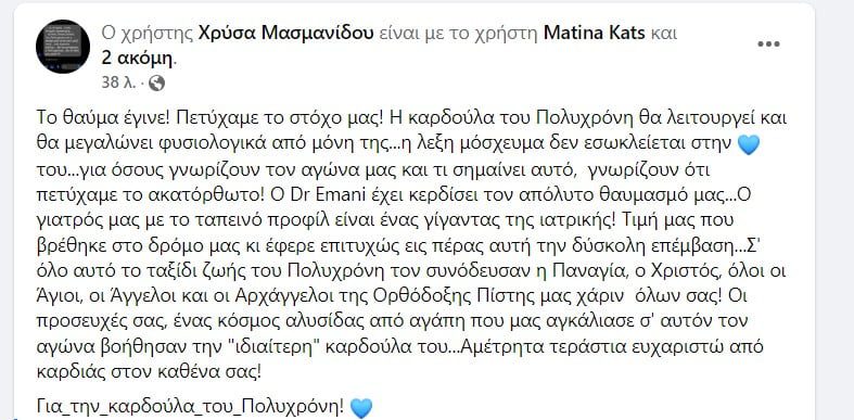 “Το θαύμα έγινε! Πετύχαμε το στόχο μας! Η καρδούλα του Πολυχρόνη θα λειτουργεί και θα μεγαλώνει φυσιολογικά από μόνη της…η λεξη μόσχευμα δεν εσωκλείεται στην 💙 του…για όσους γνωρίζουν τον αγώνα μας και τι σημαίνει αυτό, γνωρίζουν ότι πετύχαμε το ακατόρθωτο! Ο Dr Emani έχει κερδίσει τον απόλυτο θαυμασμό μας…Ο γιατρός μας με το ταπεινό προφίλ είναι ένας γίγαντας της ιατρικής! Τιμή μας που βρέθηκε στο δρόμο μας κι έφερε επιτυχώς εις πέρας αυτή την δύσκολη επέμβαση…Σ’ όλο αυτό το ταξίδι ζωής του Πολυχρόνη τον συνόδευσαν η Παναγία, ο Χριστός, όλοι οι Άγιοι, οι Άγγελοι και οι Αρχάγγελοι της Ορθόδοξης Πίστης μας χάρη όλων σας! Οι προσευχές του κόσμου που μας αγκάλιασε σε αυτό το ταξίδι γιάτρεψαν την ιδιαίτερη καρδούλα του…Χιλιάδες τεράστια ευχαριστώ από καρδιάς στον καθένα σας!