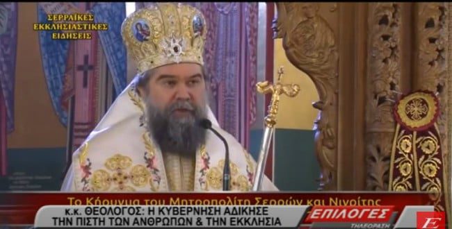 Μήνυμα προς την κυβέρνηση έστειλε ο μητροπολίτης Σερρών και Νιγρίτης, κκ Θεολόγος. Στο κήρυγμά του χθες κατά τη Θεία Λειτουργία ο κ. Θεολόγος κατηγόρησε την κυβέρνηση για το ότι αδίκησε την πίστη των ανθρώπων αλλά και γιατί όπως είπε αδίκησε την ίδια την εκκλησία.
