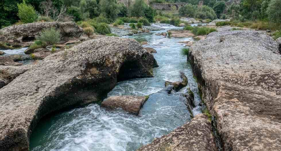 Η ανατολική όχθη του ποταμού είναι απότομη καθώς υπάρχει ένα ύψωμα, αντίθετα η δυτική όχθη είναι ομαλή και υπάρχει ένα παρόχθιο μονοπάτι το οποίο σε οδηγεί σε ένα σύμπλεγμα βράχων που αναπτύσσεται στην κοίτη του ποταμού βόρεια του γεφυριού και είναι ορατό κατά τους θερινούς μήνες όπου η στάθμη των νερών είναι χαμηλότερη. Εκεί σου δίνεται η δυνατότητα να παρατηρήσεις και να θαυμάσεις πώς η ροή του νερού του ποταμού έχει σχηματίσει το ανάγλυφο στους βράχους, όπου η κύρια ροή του ποταμού σχηματίζει πολλές διακλαδώσεις, δημιουργώντας μικρές λιμνούλες.