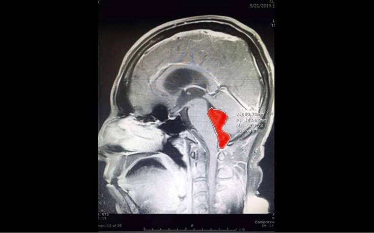 Η μαγνητική υπέδειξε μια κύστη στην τέταρτη κοιλία, πίσω από τον προμήκη μυελό και τη γέφυρα.