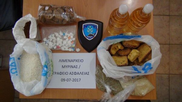 Ακολούθησε η σύλληψη του 27χρονου, η κατάσχεση των ποσοτήτων ναρκωτικών ουσιών, καθώς επίσης του οχήματος και μίας συσκευής κινητού τηλεφώνου για να οδηγηθεί την επομένη στη Μυτιλήνη, ενώπιον του Εισαγγελέα. Μάλιστα στη σχετική φωτογραφία φιγουράρουν και τα υπόλοιπα…προϊόντα που κατασχέθηκαν, όπως ντάκος, φακές, παξιμάδια και δυο μπουκάλια κρασί!