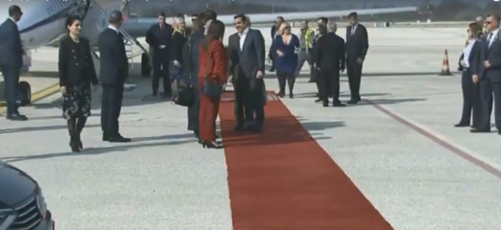 Τον πρωθυπουργό της Ελλάδας υποδέχτηκαν στο αεροδρόμιο των Σκοπίων η εκ των αντιπροέδρων της κυβέρνησης και υπουργός Άμυνας της Βόρειας Μακεδονίας Ραντμίλα Σεκερίνσκα και ο υπουργός Οικονομίας Κρέσνικ Μπεκτέσι.
