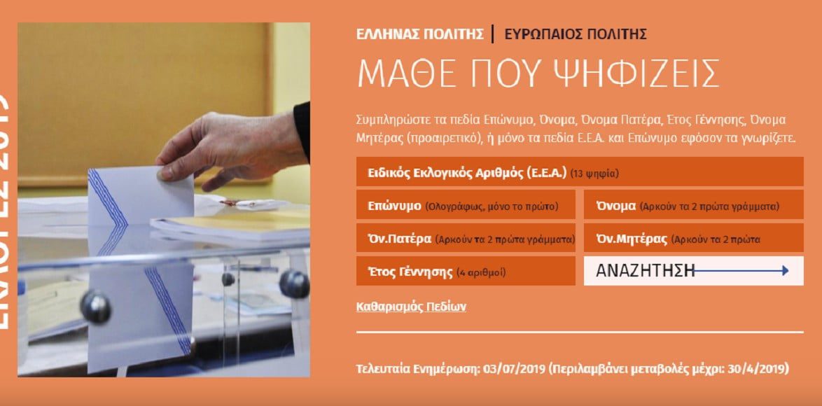 Για το λόγο αυτό, το ΥΠΕΣ συνιστά προς τους εκλογείς να αναζητήσουν το εκλογικό τους τμήμα στην ιστοσελίδα του υπουργείου Εσωτερικών (www.ypes.gr), στην ειδική εφαρμογή «Μάθε που Ψηφίζεις» ή να καλέσουν στο τηλεφωνικό κέντρο της Διεύθυνσης Ηλεκτρονικής Διακυβέρνησης του υπουργείου Εσωτερικών και στον αριθμό 213 136 1500, έως και την Κυριακή, από τις 09:00 έως τις 19:00, προκειμένου να επιβεβαιώσουν το εκλογικό τμήμα στο οποίο θα ασκήσουν το εκλογικό τους δικαίωμα την προσεχή Κυριακή.