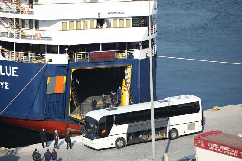 Κάτω από δρακόντεια μέτρα ασφαλείας και προστασίας της δημόσιας υγείας, 600 περίπου πρόσφυγες που ήρθαν στην Καβάλα με το πλοίο Άκουα Μπλου επιβιβάζονται αυτήν την ώρα σε λεωφορεία