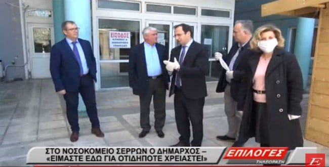 Ο διοικητής του νοσοκομείου Σερρών , Νίκος Φαρμάκης και ο Υποδιοικητής Παναγιώτης Πεγίδης , υποδέχονται το δήμαρχο Σερρών , ο οποίος δώρισε το σπιτάκι του Αη Βασίλη, προκειμένου να χρησιμοποιηθεί από το νοσοκομείο με όποιο τρόπο κρίνει καλύτερο , ενόψει του αγώνα κατά του κορωνοϊού.