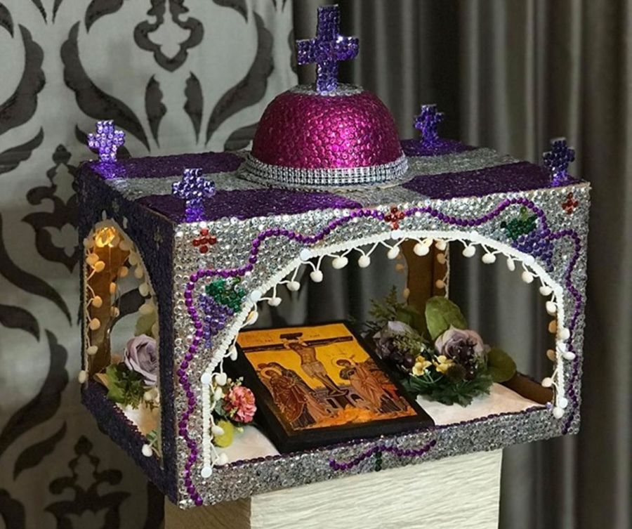 Σκέφτηκαν να χρησιμοποιήσουν ένα χαρτόκουτο και το διακόσμησαν με 5.000 περίπου πούλιες. Μάλιστα μόλις τον ολοκλήρωσαν τον δώρισαν στον Ιερό Ναό της του Θεού Σοφίας της ενορία τους.