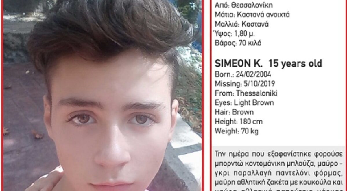 Σύμφωνα με ανακοίνωση που εξέδωσε το “Χαμόγελο του Παιδιού”, πρόκειται για τον Συμεών Κ.,, ηλικίας 15 ετών, τα ίχνη του οποίου χάθηκαν το βράδυ του περασμένου Σαββάτου.