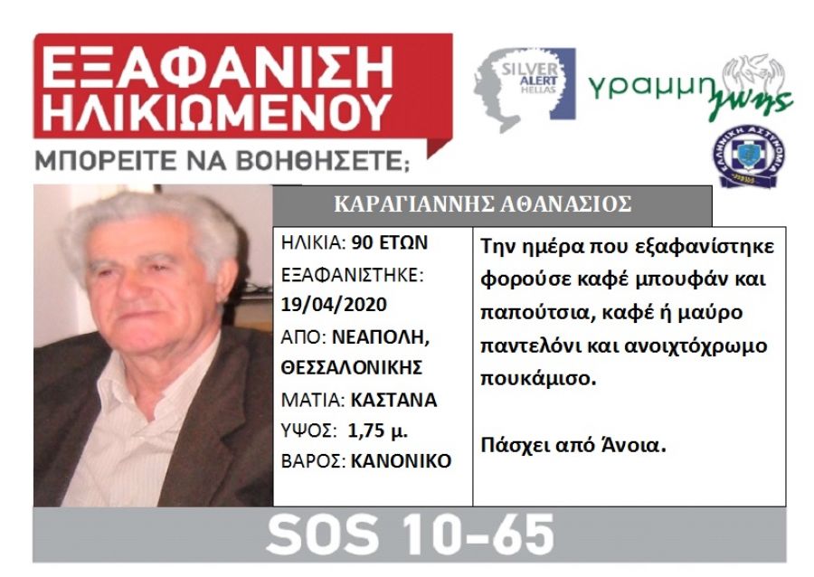 Πρόκειται για τον 90χρονο Καραγιάννη Αθανάσιο, ο οποίος εξαφανίστηκε από τις 19 Απριλίου. Την ημέρα που εξαφανίστηκε φορούσε καφέ μπουφάν και παπούτσια, καφέ ή μαύρο παντελόνι και ανοιχτόχρωμο πουκάμισο.