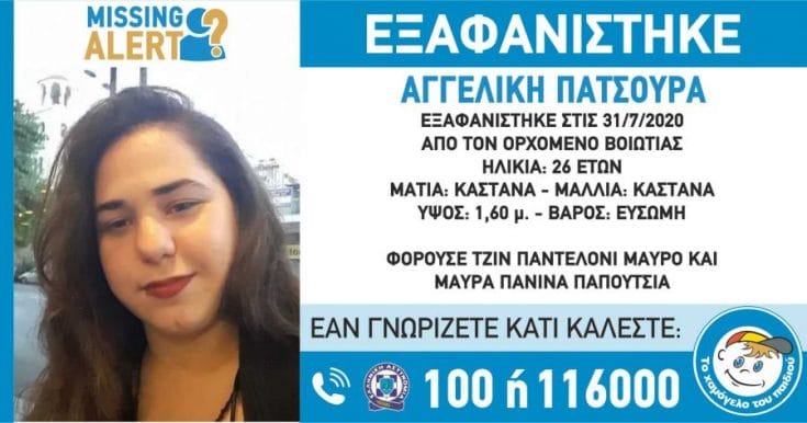 Συναγερμός σήμανε στις αρχές της Βοιωτίας για την εξαφάνιση της 26χρονης Αγγελικής Πατσούρα.