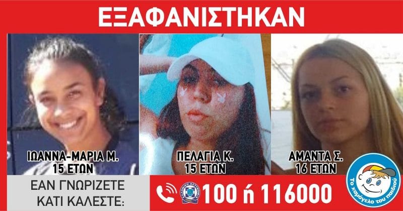 “Στις 02/11/2020 και ώρα 20:30, εξαφανίστηκαν από την περιοχή της Αγίας Παρασκευής, η Πελαγία (ον.) Κ.(επ.), 15 ετών, η Αμάντα (ον.) Σ.(επ.), 16 ετών και η Ιωάννα-Μαρία (ον.) Μ.(επ.), 15 ετών.