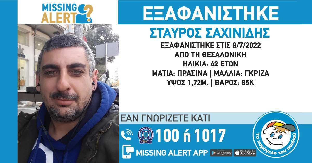 Στις 08/07/22, εξαφανίστηκε από την περιοχή της Θεσσαλονίκης, ο Σαχινίδης Σταύρος, 42 ετών. Το «Χαμόγελο του Παιδιού» προχώρησε στη δημοσιοποίηση των στοιχείων του ενηλίκου κατόπιν αιτήματος της οικογένειας, καθώς συντρέχουν λόγοι οι οποίοι θέτουν τη ζωή του σε κίνδυνο.