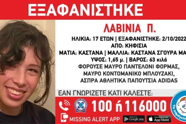 Πρόκειται για τη 17χρονη Λαβίνια Π., η εξαφάνιση της οποίας έγινε χθες από την περιοχή της Κηφισιάς και σήμερα γίνεται γνωστή από το «Χαμόγελο του Παιδιού». Η 17χρονη έχει ύψος 1,65 μ., βάρος 63 κιλά, έχει καστανά σγουρά μακριά μαλλιά και καστανά μάτια.