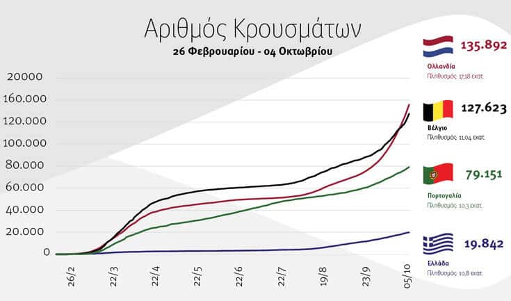 Ο κ. Πέτσας έδειξε και τρία διαγράμματα που αποτυπώνουν την πορεία της Ελλάδας σε αριθμούς κρουσμάτων και θανάτων, σε σχέση με άλλες χώρες με παρόμοιο πληθυσμό.