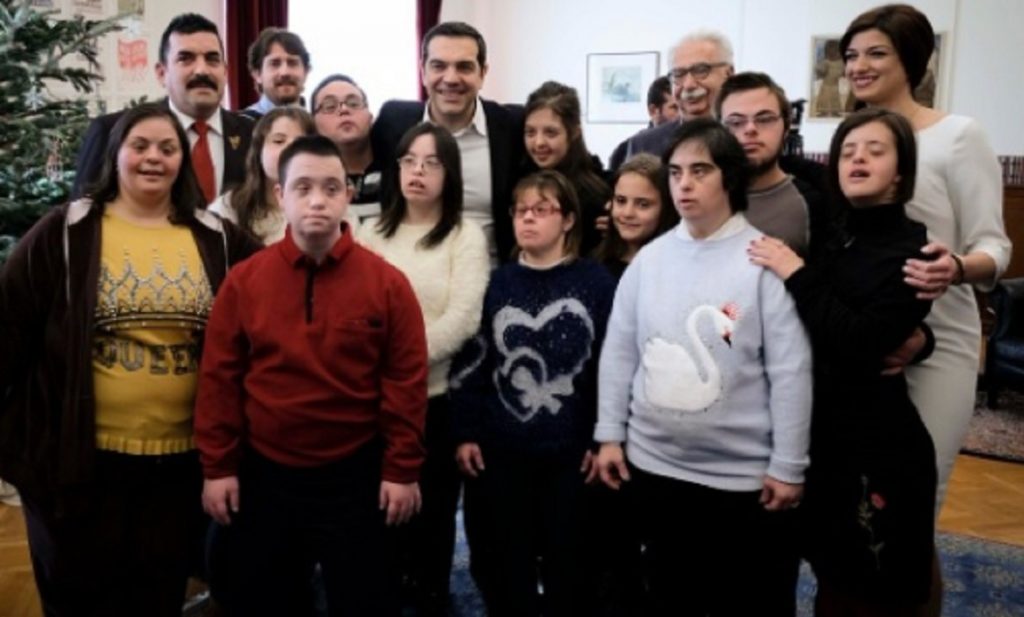 Πριν ξεκινήσει η συνάντηση, ο πρωθυπουργός άκουσε τα κάλαντα από παιδιά του Συλλόγου Down Βορείου Ελλάδος.