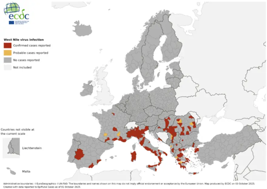 του Δυτικού Νείλου (WNV) στην Ευρώπη από το 2007 έως το 2025. (* δεδομένα έως 03/09/2025 και
