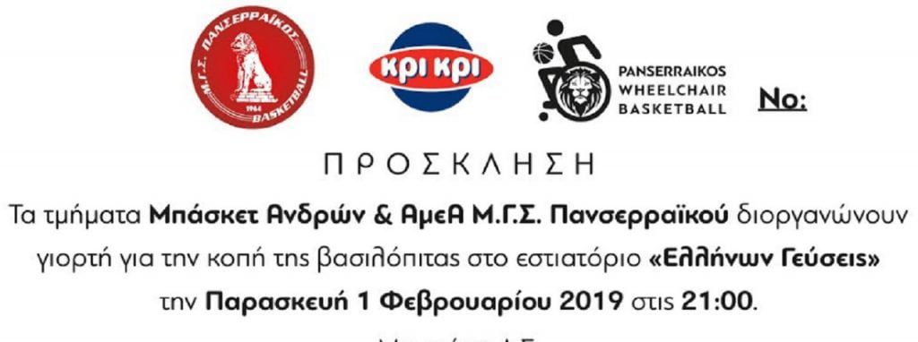 Τα τμήματα Μπάσκετ Ανδρών και ΑμΕΑ του Μ.Γ.Σ. Πανσερραϊκού διοργανώνουν γιορτή για την κοπή της καθιερωμένης βασιλόπιτας στο εστιατόριο «Ελλήνων Γεύσεις» αυτή την Παρασκευή 1 Φεβρουαρίου 2019 και ώρα 21:00.
