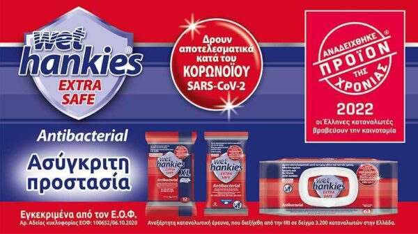 Τα Wet Hankies Antibacterial Extra Safe ήταν τα πρώτα αντιβακτηριδιακά μαντήλια στην Ελλάδα που έδωσαν απάντηση στην ανάγκη για εγγυημένη ενισχυμένη αντιβακτηριδιακή προστασία, εξασφαλίζοντας, μέσα από εξειδικευμένα τεστ υψηλών απαιτήσεων, επιστημονικά αποδεδειγμένη δράση και κατά του κορωνοϊού SARS-CoV-2.