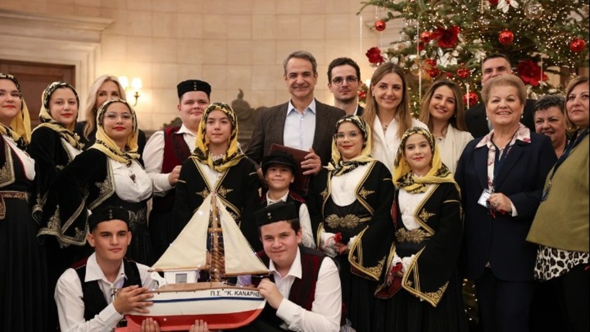Ειδικότερα, τα κάλαντα έψαλλαν μαθήτριες και μαθητές του Μουσικού Σχολείου Αλίμου και μέλη του Πολιτιστικού Συλλόγου Ερέτριας «Κωνσταντίνος Κανάρης». Στη συνέχεια, ο πρωθυπουργός και η οικογένειά του αντάλλαξαν μαζί τους ευχές και δώρα για τις γιορτές.