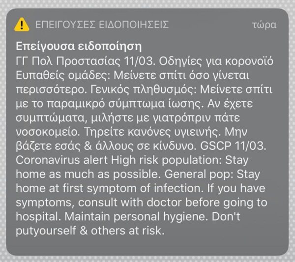 Μήνυμα της Πολιτικής Προστασίας σε όλους τους χρήστες κινητών τηλεφώνων με οδηγίες για τον κορωνοϊό