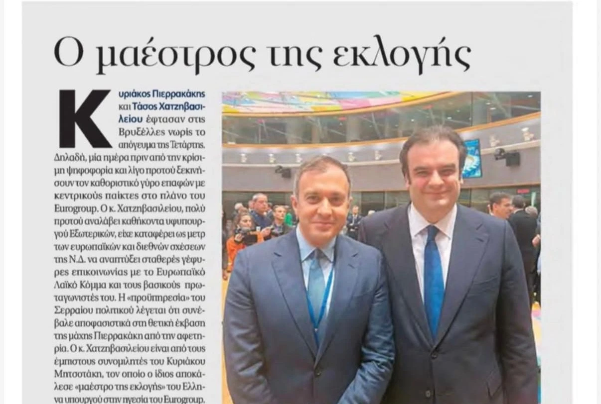 Με τον τίτλο “ο μαέστρος της εκλογής” η εφημερίδα Πρώτο Θέμα αναδεικνύει τον ρόλο και την τεράστια συμβολή του Τάσου Χατζηβασιλείου στην εκλογή του Έλληνα υπουργού Οικονομικών Κ. Πιερρακάκη στη θέση του προέδρου του Eurogroup.